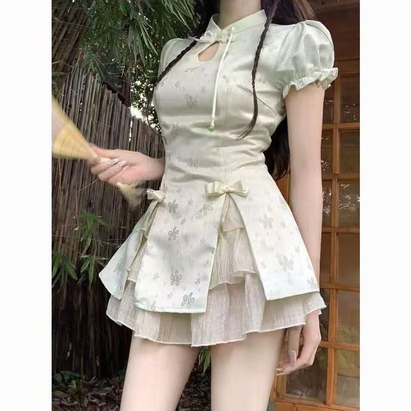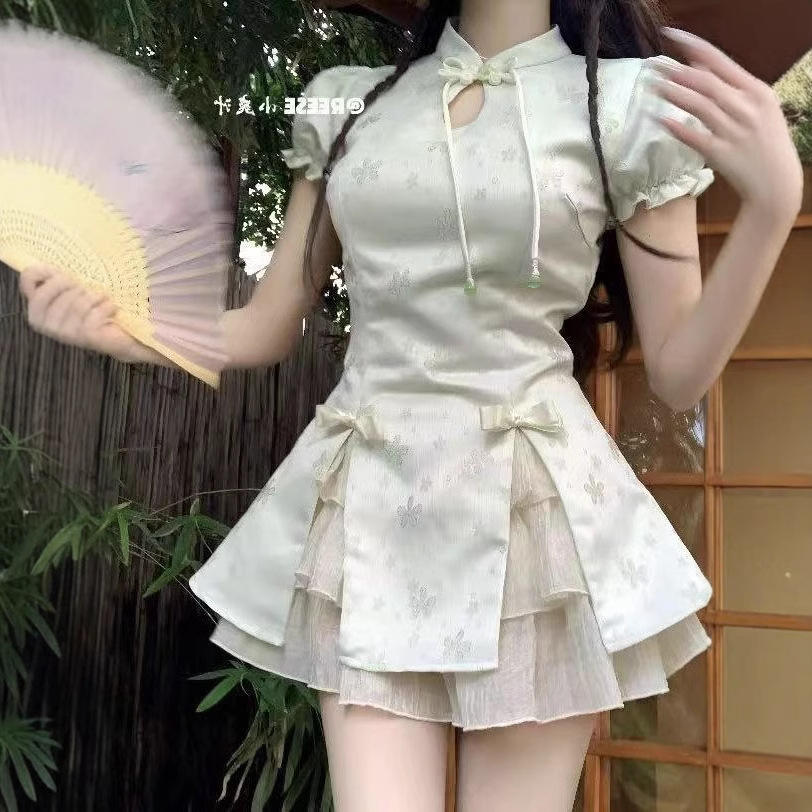 Traditional Chinese Style Cute Modified Cheongsam Dress with Short Sleeve Solid Color Two Piece Skirt Set for Women Party Wear
