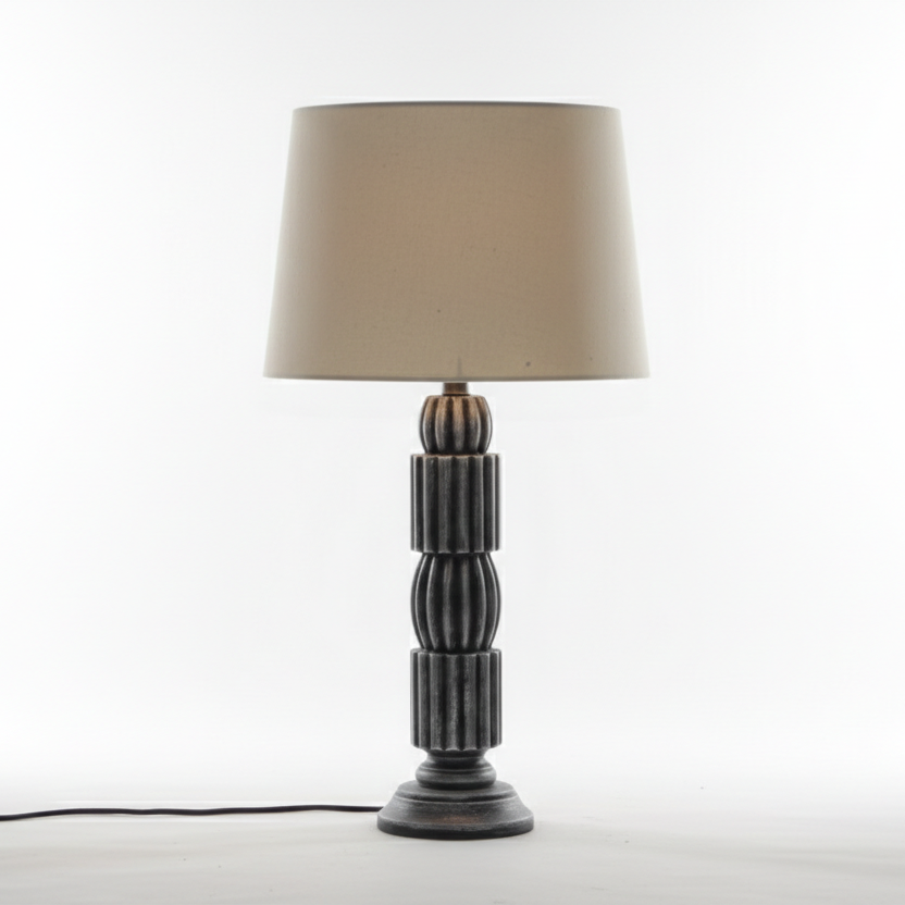 Lampe de table décorative traditionnelle avec base de style colonne sculptée, abat-jour en tissu neutre et structure solide pour chambre à coucher