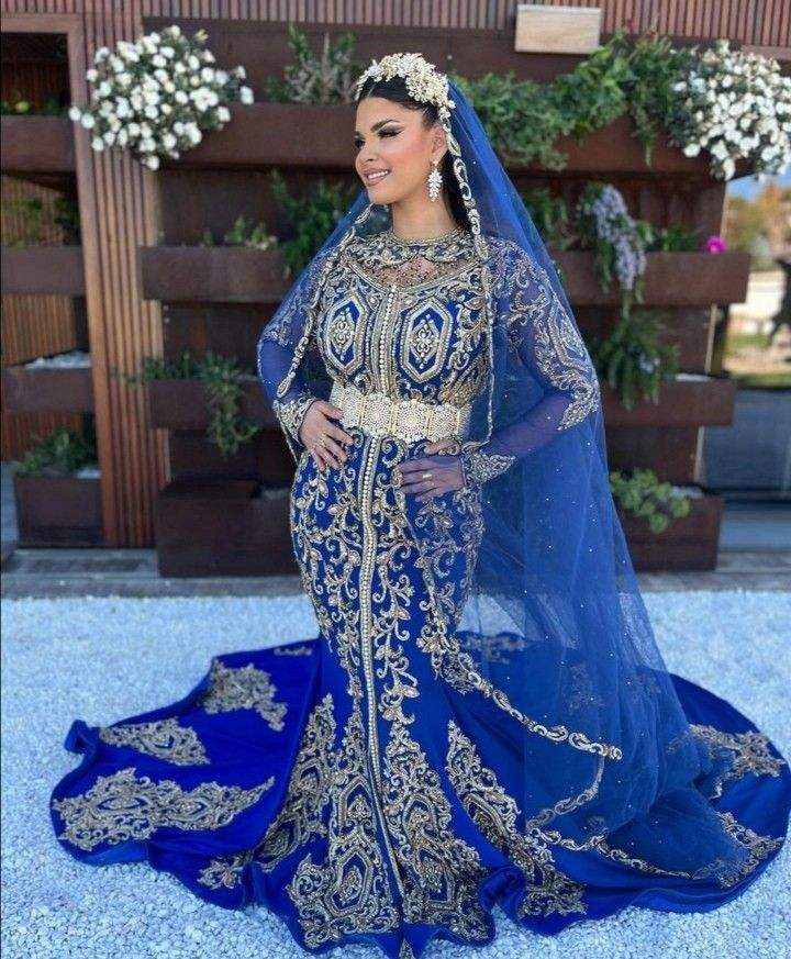 Broderie traditionnelle Zardozi à la main sur une robe Caftan bleu royal coupée au poisson avec Trail & Veil pour mariage = 2025