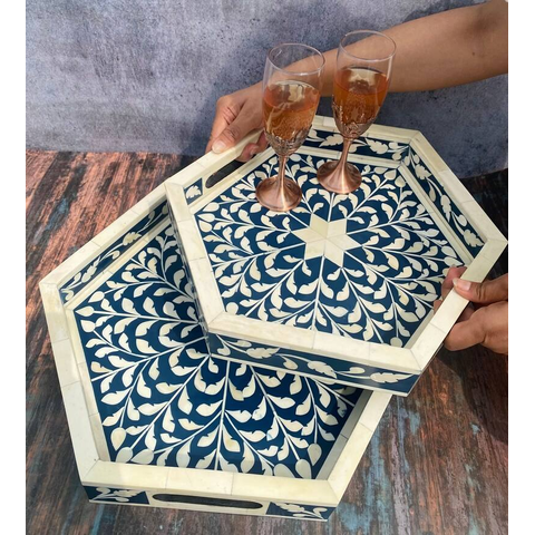 Plateau de service traditionnel écologique en os incrusté, motif floral et végétal en bois, pour table à manger, table basse ou usage décoratif