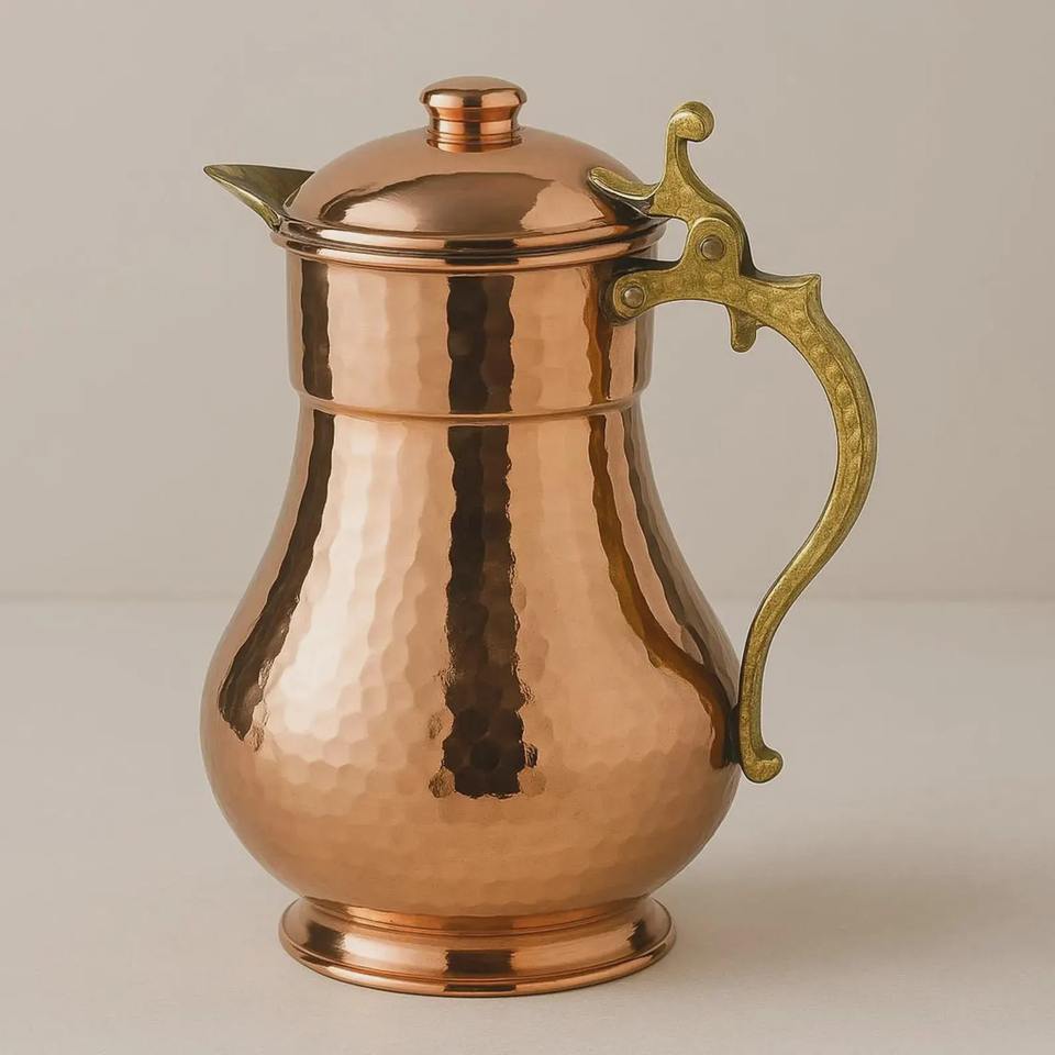 Pichet traditionnel en cuivre martelé à la main avec couvercle et poignée en laiton, idéal pour les dîners culturels et les réceptions festives