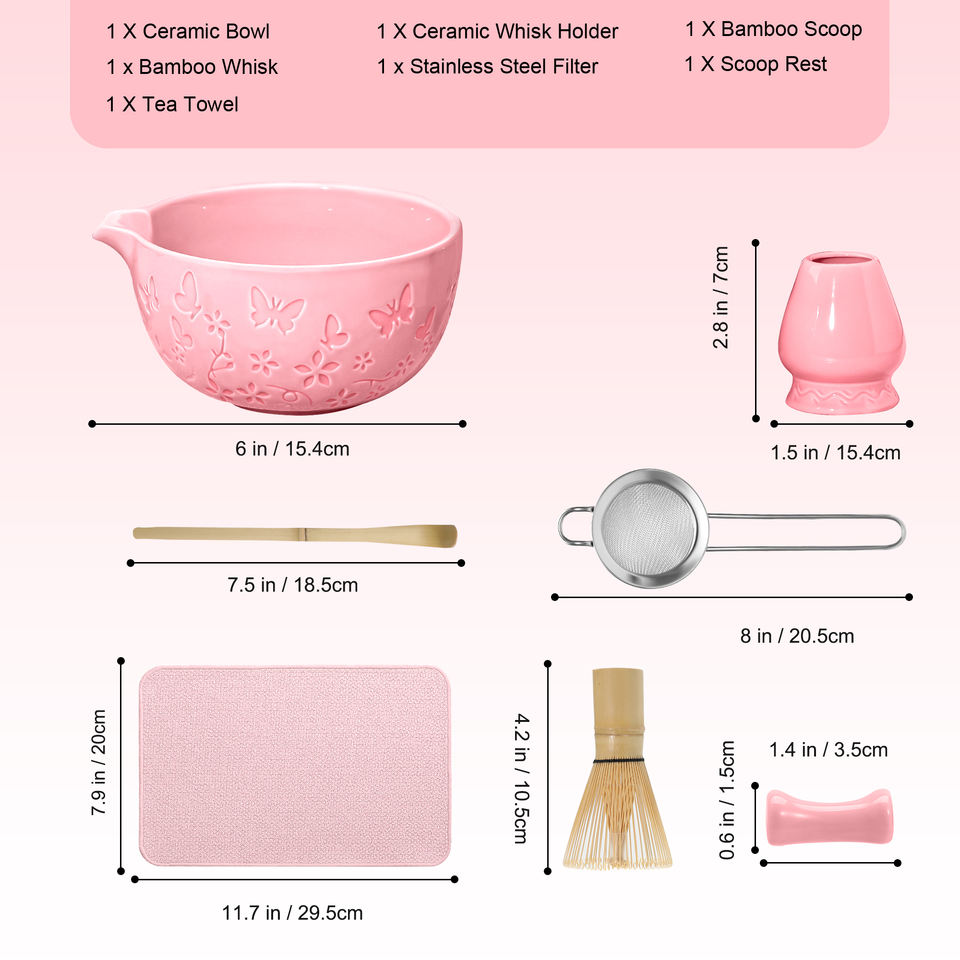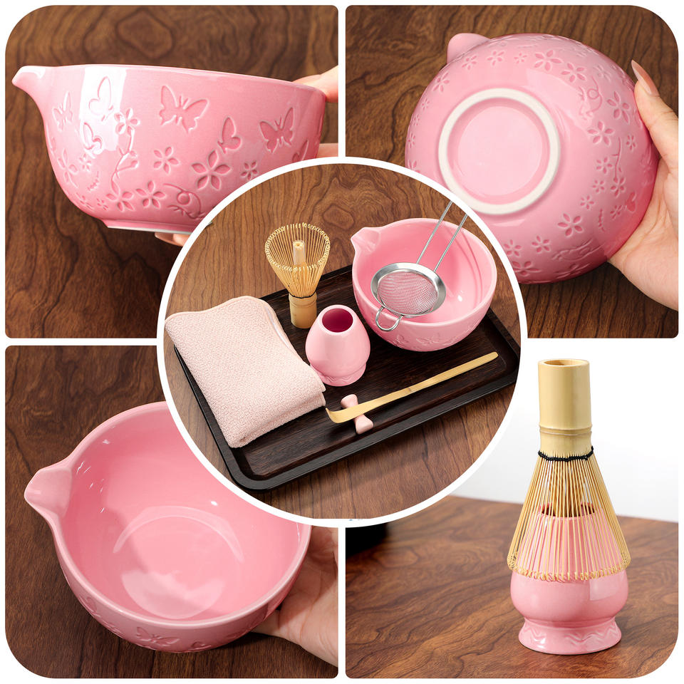 Ensemble de thé matcha traditionnel japonais de 7 pièces avec motif papillon gravé, bol, fouet en bambou, accessoires en céramique pour matcha