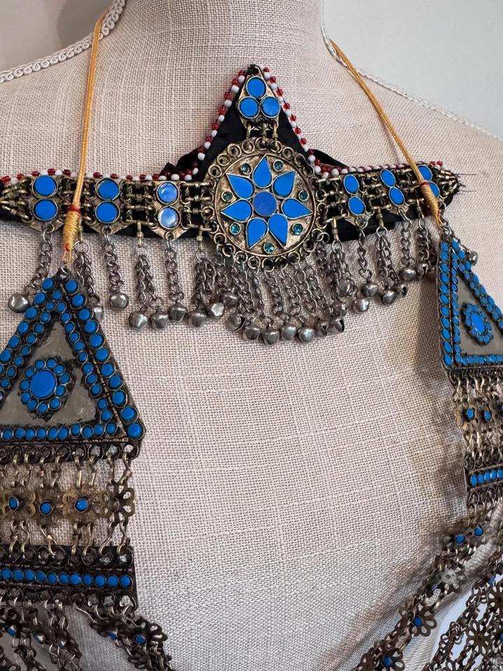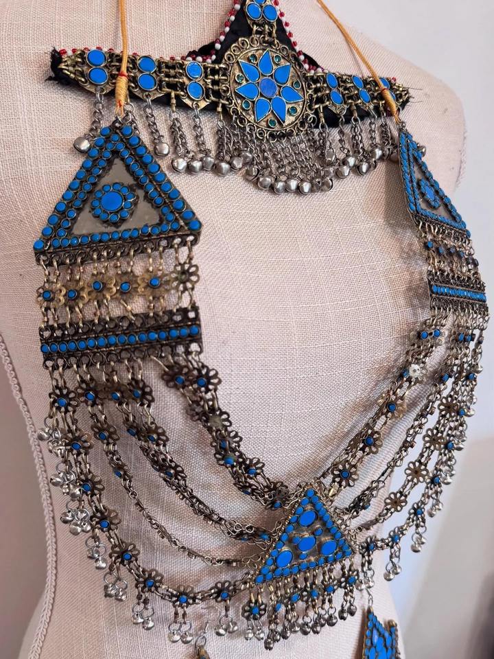 Ensemble de colliers superposés traditionnels du peuple Kuchi avec pierres bleu turquoise, chaînes lourdes, clochettes et grandes boucles d'oreilles, style bohème nomade