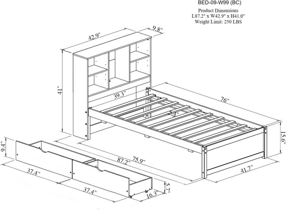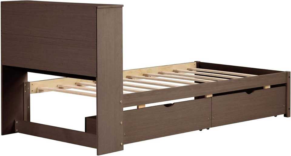 Cadre de lit double moderne et traditionnel avec 2 tiroirs de rangement, tête de lit bibliothèque simple, en bois de pin massif durable