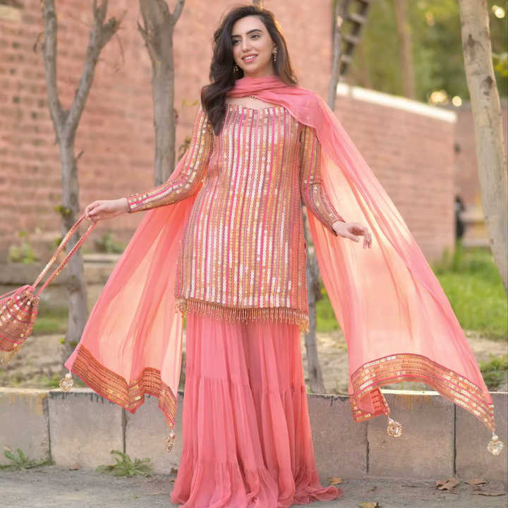 Ensemble de costume Palazzo traditionnel entièrement cousu, prêt à porter, composé d'un haut, d'un pantalon Palazzo et d'un dupatta, design élégant pour femmes, collection pour occasions spéciales.