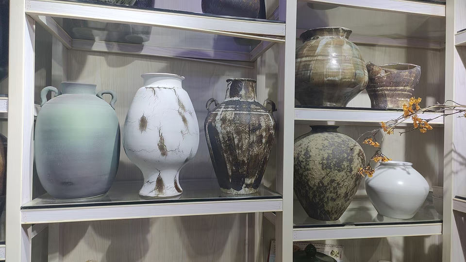 Pichet en céramique de poterie traditionnelle Vase en céramique Vase en terre cuite gris et bleu avec 2 poignées pour décorations intérieures/extérieures