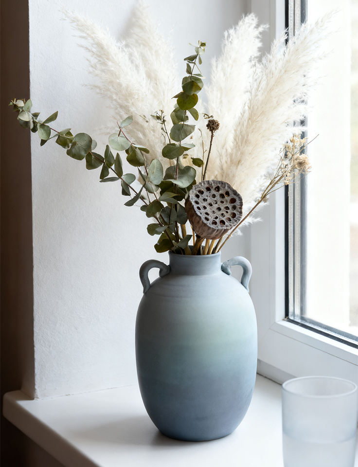 Nom du produit:Vase en terre cuite gris et bleu avec 2 poignées pour décor intérieur/extérieur