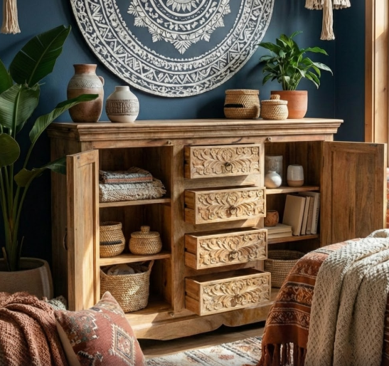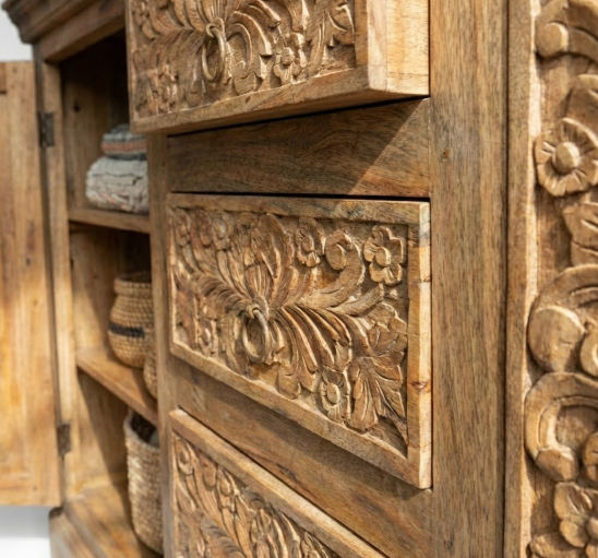 Buffet rustique artisanal en bois de manguier massif traditionnel avec 2 portes et 3 tiroirs, design modulaire écologique pour salles à manger domestiques