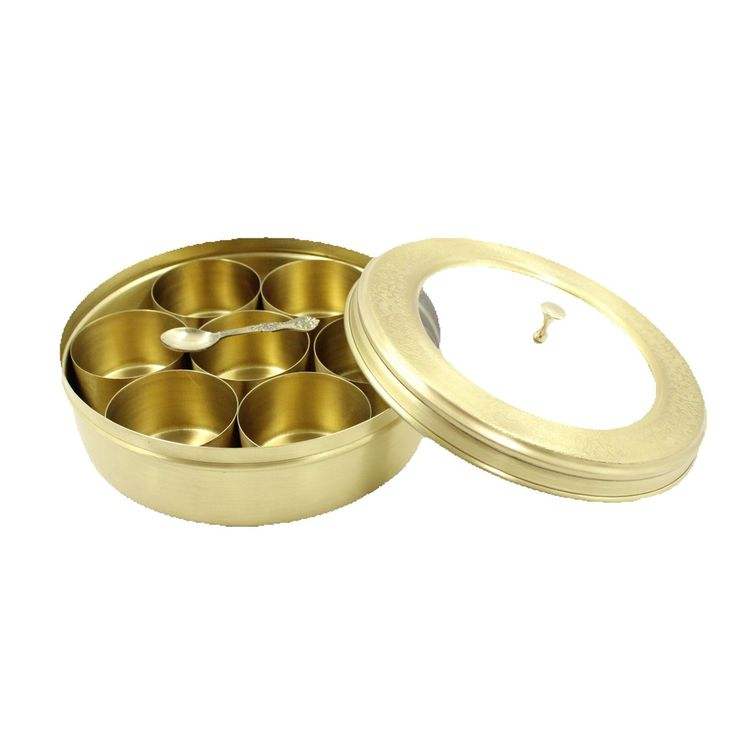 Boîte à masala en métal de style traditionnel pour conserver les épices indiennes fraîches, organisées et prêtes pour la cuisine quotidienne