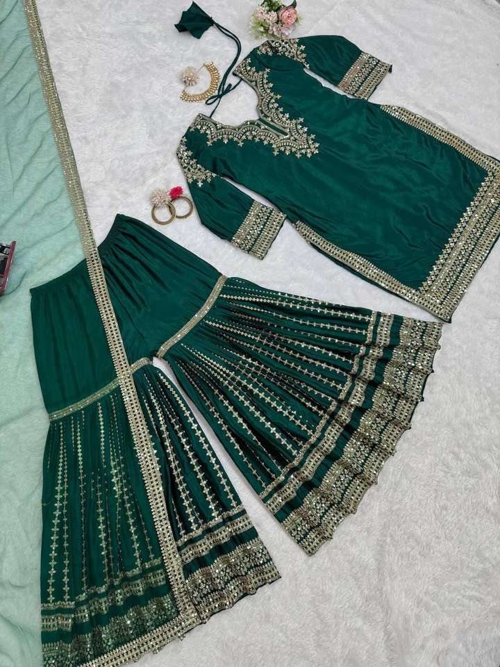 Fil de soie Chinon traditionnel avec haut de travail à broderie séquentielle et Sharara avec bordure en dentelle à quatre côtés Dupatta