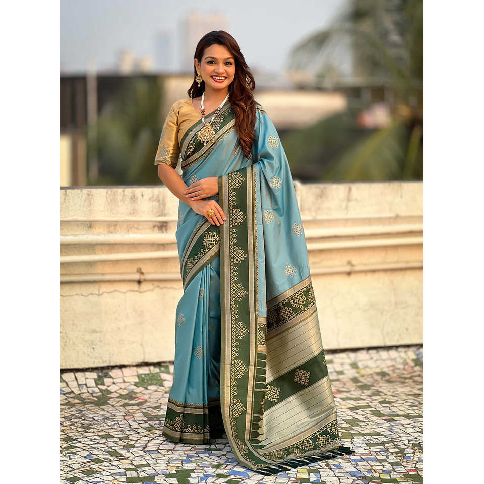 Traditional Zari Contrast Woven Saree Soft Silk Baby Blue Club Dress with Elegant Style