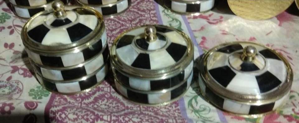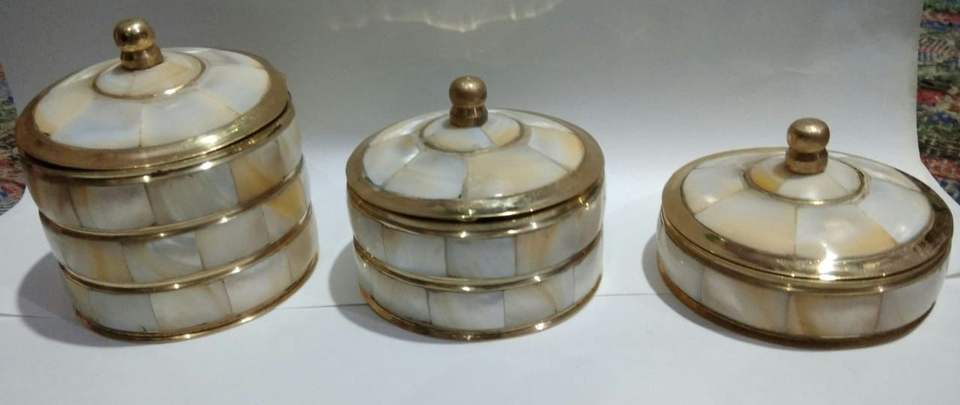 Boîte en laiton traditionnel avec incrustation de perles, Kumkum, Design en mosaïque et forme ronde pour garder la boîte sceau de femme, bijoux