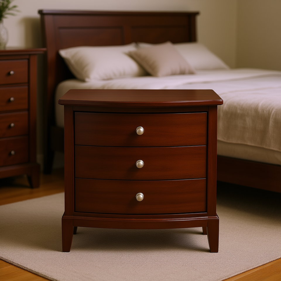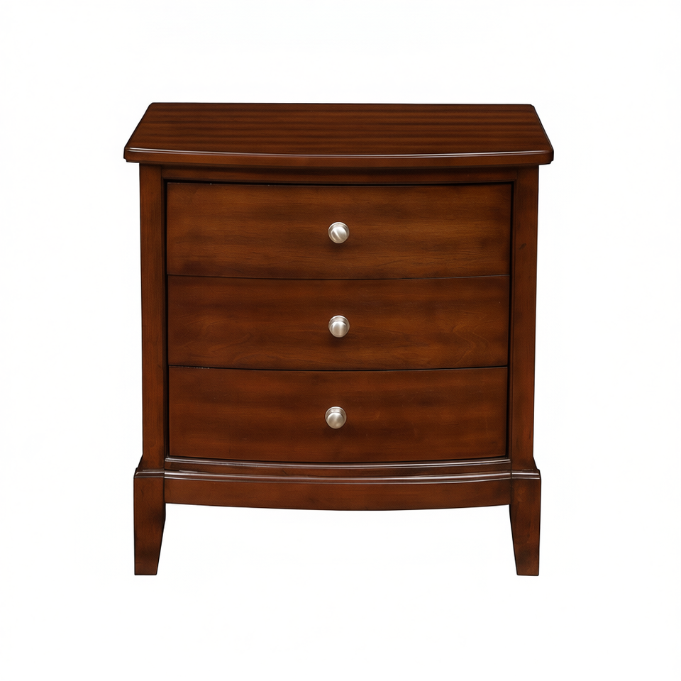 Table de chevet de style transitionnel, finition cerisier foncé, 3 tiroirs, poignées en nickel satiné, meubles de chambre à coucher