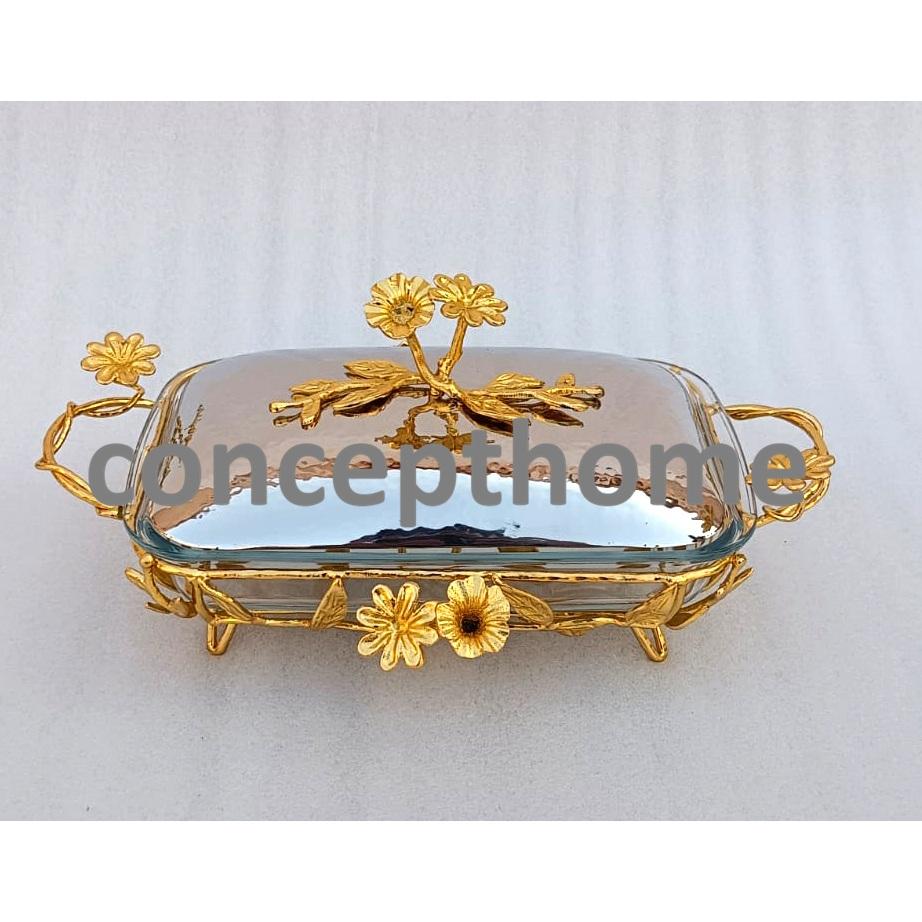 Transparent Glass Made Rectangle Shape Dish With High Grade Gold Plated Designer Base Stand And Top Lid logo accept western
