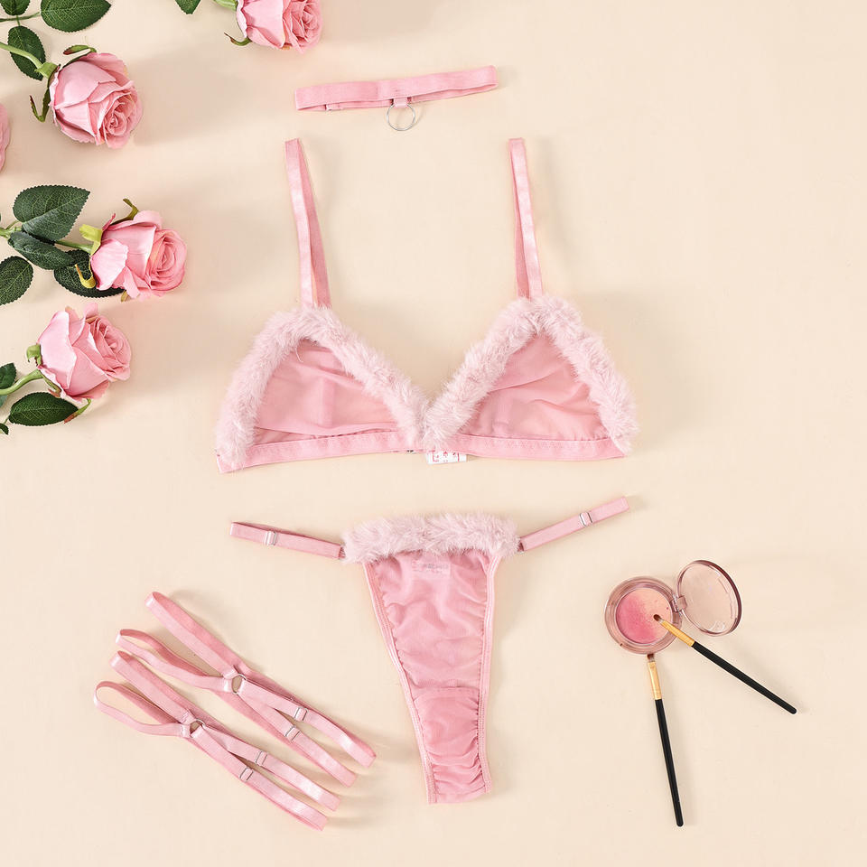 Ensemble de lingerie en maille transparente avec bordure en fourrure, lingerie sexy pour l'hiver, lingerie transparente pour femmes