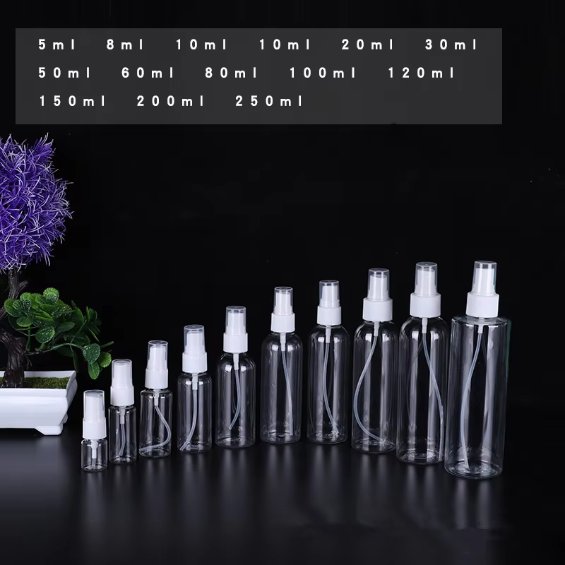 Bouteille de pulvérisation PET à brume fine en plastique transparent gamme de vente chaude emballage cosmétique manipulation de Surface de sérigraphie 10ml-250ml