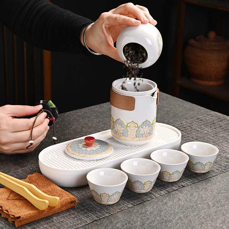 Service à thé de voyage portable, ensemble de thé Kung Fu d'extérieur, une théière, trois tasses, en céramique et porcelaine, style antique Dehua, cadeau d'affaires