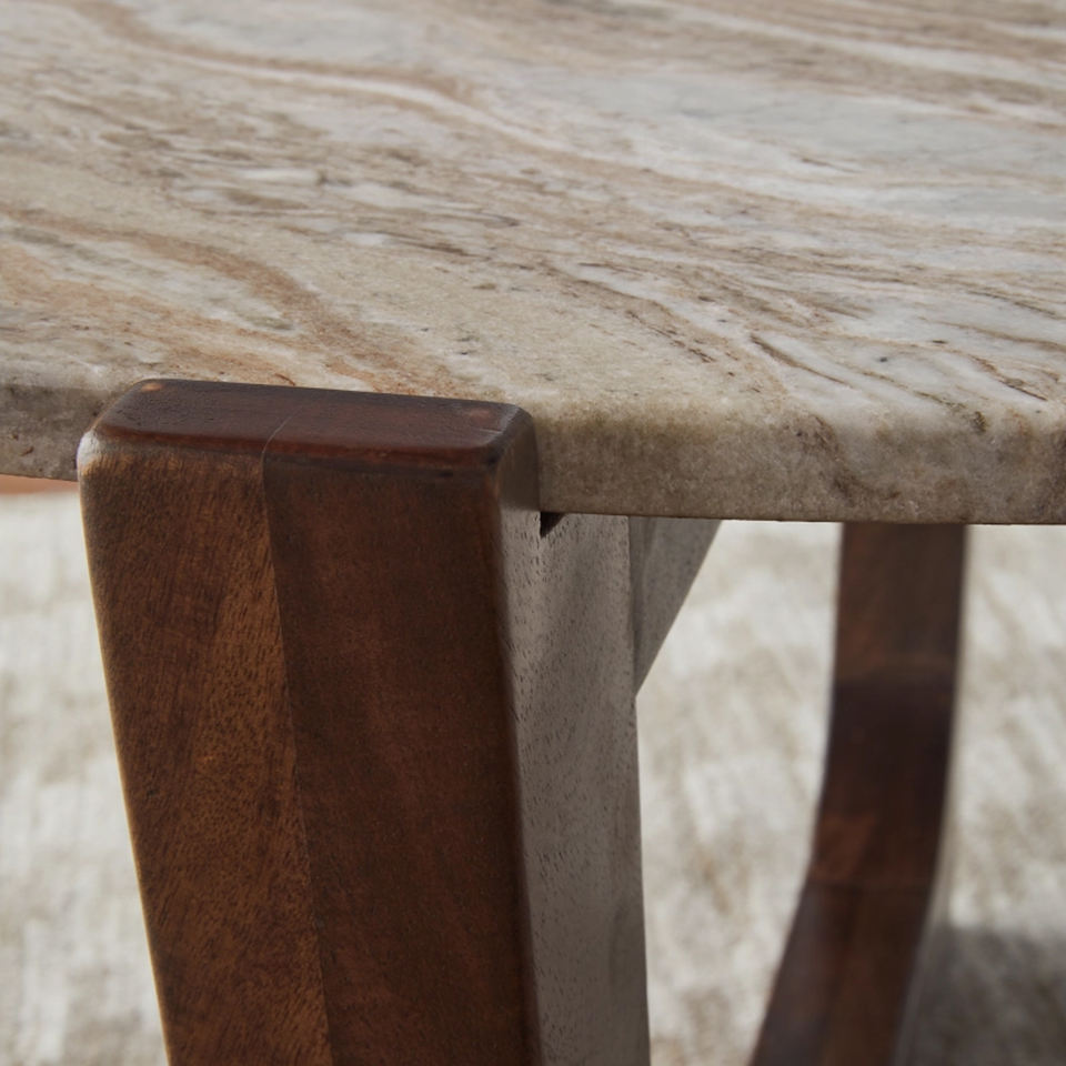 Table basse de salon moderne, durable et écologique, avec plateau rond en marbre travertin et pieds pliants en bois de manguier massif finition marron