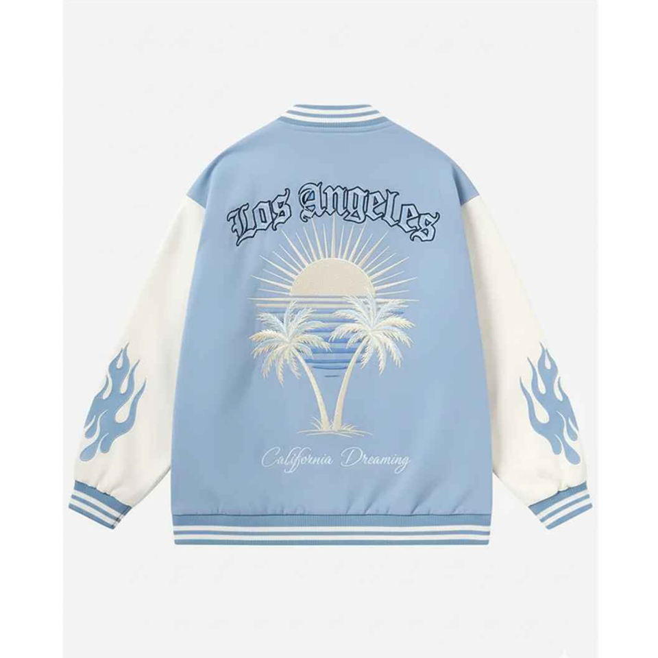 Tendance Logo de broderie personnalisé LA bleu Varsity Bomber Jacket décontracté à manches longues en laine et cuir Varsity Jacket pour unisexe
