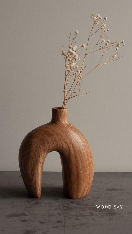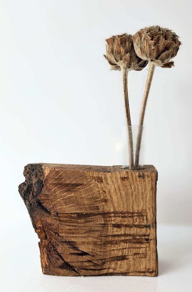 Vase à fleurs en bois au design tendance pour la décoration d'étagères de salon de style farmhouse, avec finition vieillie et motif bois naturel
