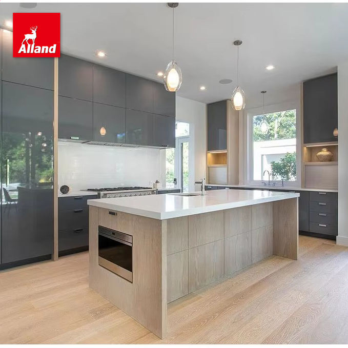Placard de cuisine gris brillant mélangé avec des dalles de chêne teinté avec hotte dissimulée et de nombreuses armoires de rangement