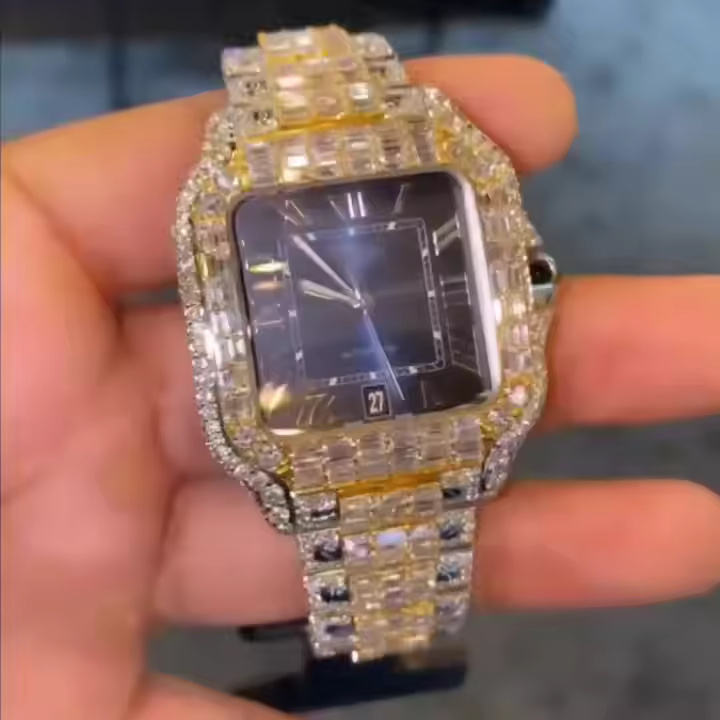 Tendance Sport Mode Hommes 20mm Largeur Glacé Moissanite Diamant Montre Entièrement Personnalisé Carré Verre Cadran Fenêtre En Acier Inoxydable