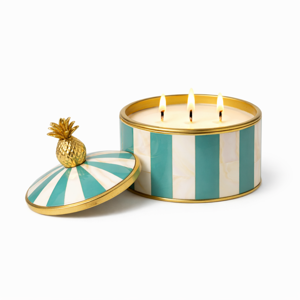 Nouvelle bougie décorative de luxe tendance en métal avec incrustation de nacre, trois mèches, motif rayé bleu aqua et couvercle ananas doré, parfumée et haut de gamme