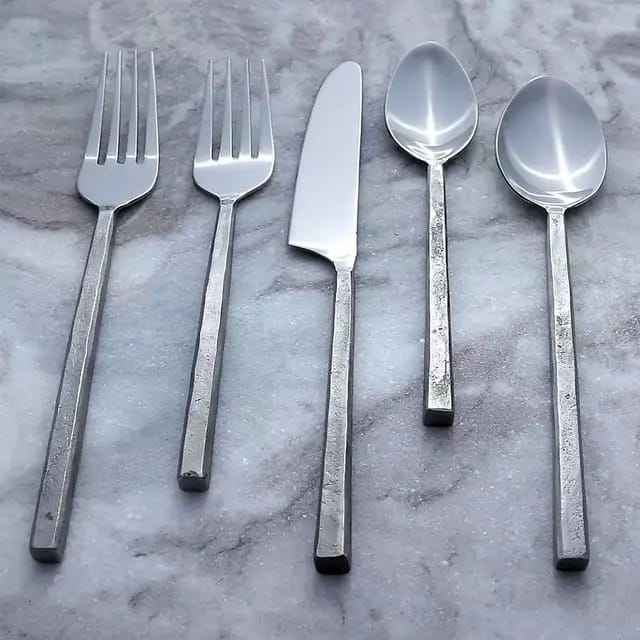 Ensemble de couverts modernes en acier inoxydable tendance, poli miroir, compatible lave-vaisselle, durable, cinq pièces, cuillère, fourchette, couverts de mariage