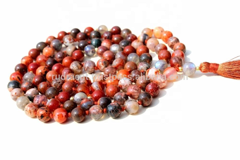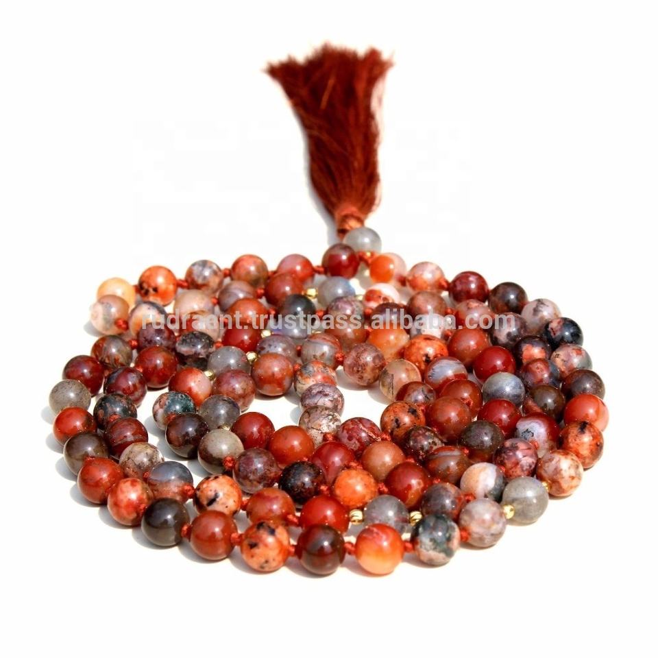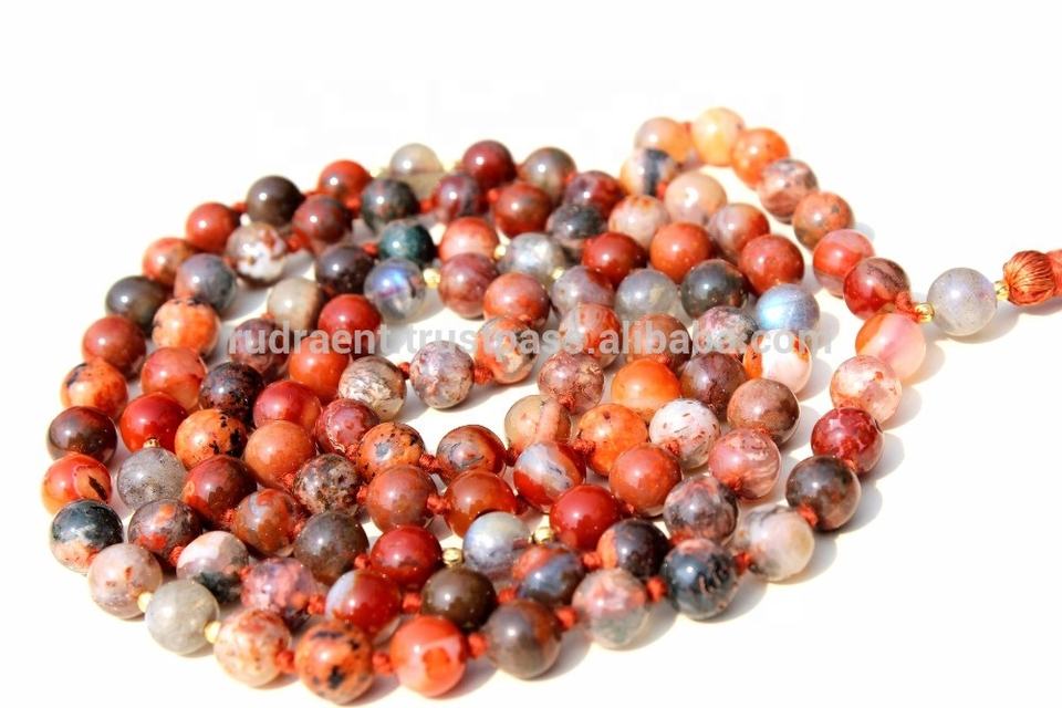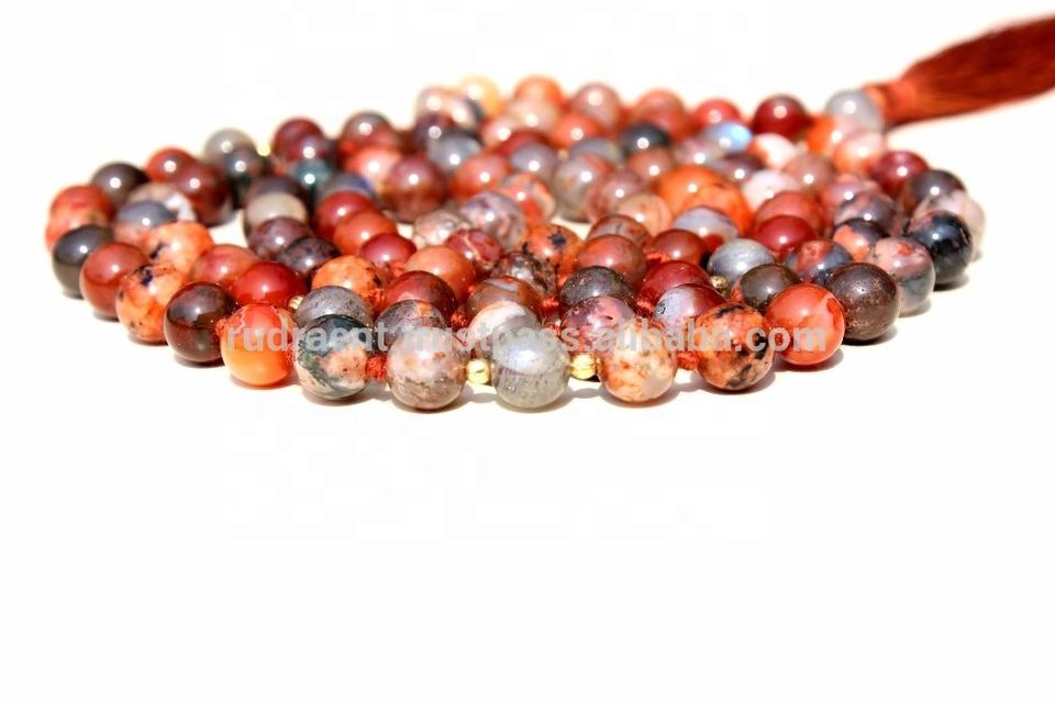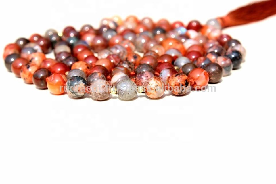 Agate de feu naturelle nouée 108 perles de Mala rondes faites à la main colliers de perles d'artiste indien