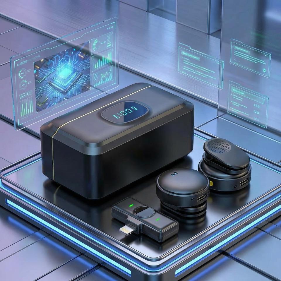 Microphone cravate portable professionnel anti-bruit avec affichage numérique et étui pour diffusion mobile en direct