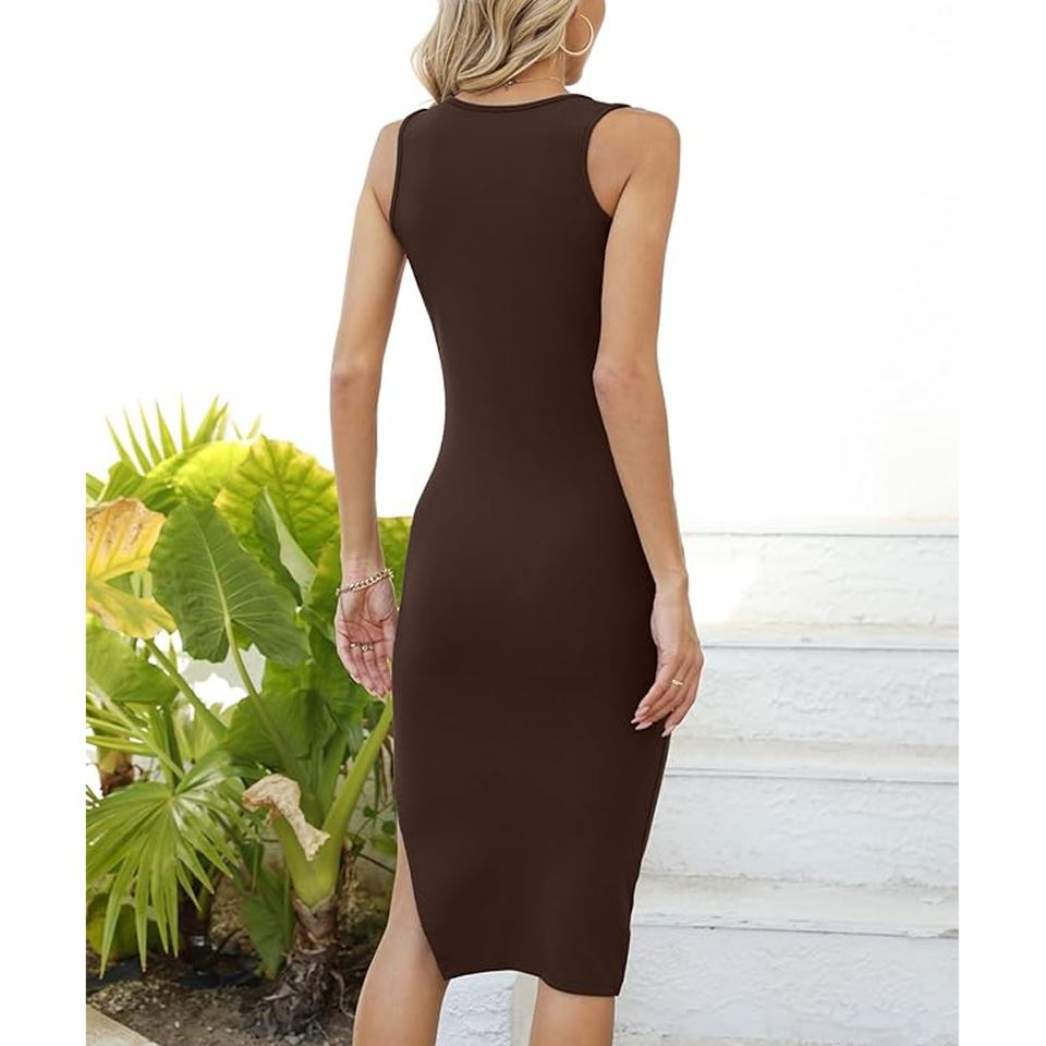 Tendance Top qualité femmes été côtelé tricot sans manches col carré débardeur moulante crayon robe mi-longue