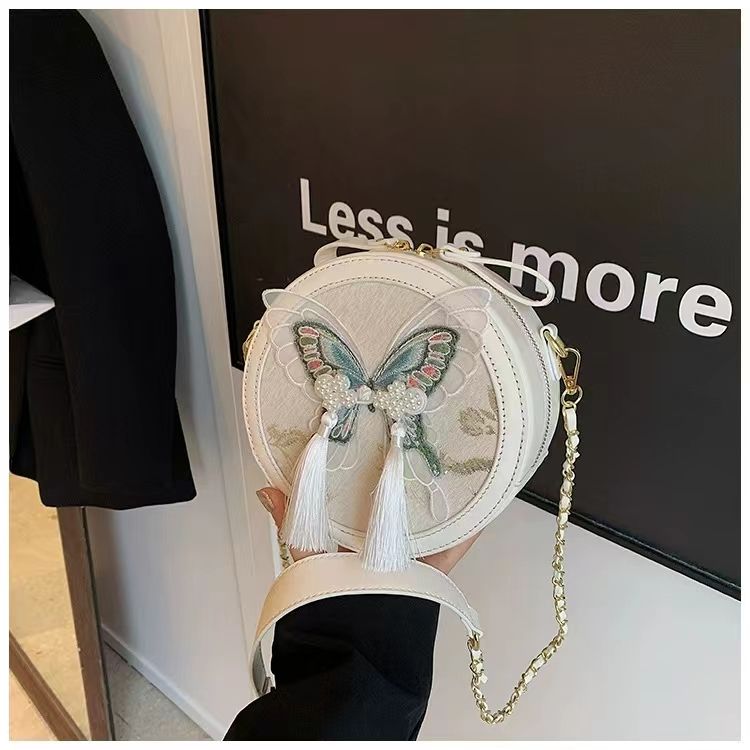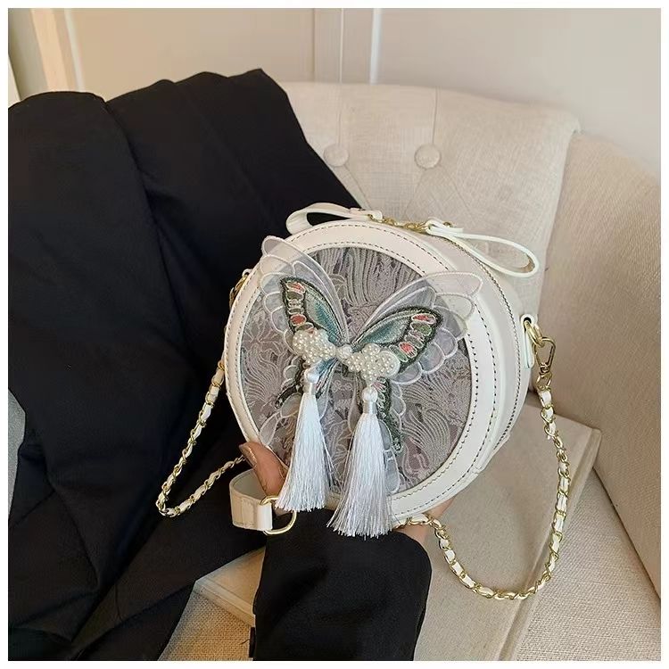 Trending Wholesale PU Leather Handbags Women New Chinese Style Butterfly Tassel Round Crossbody Bags
