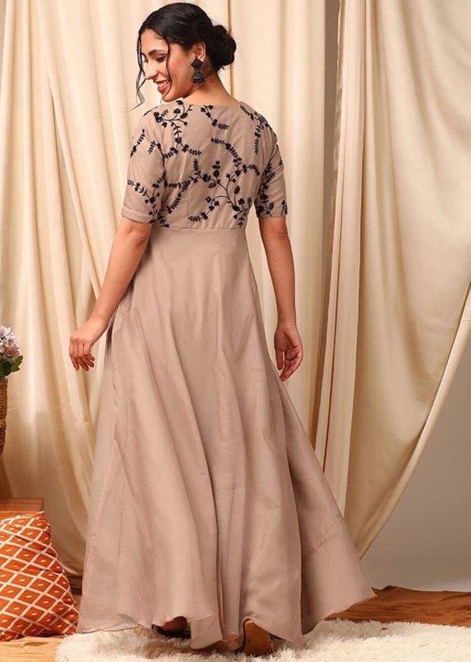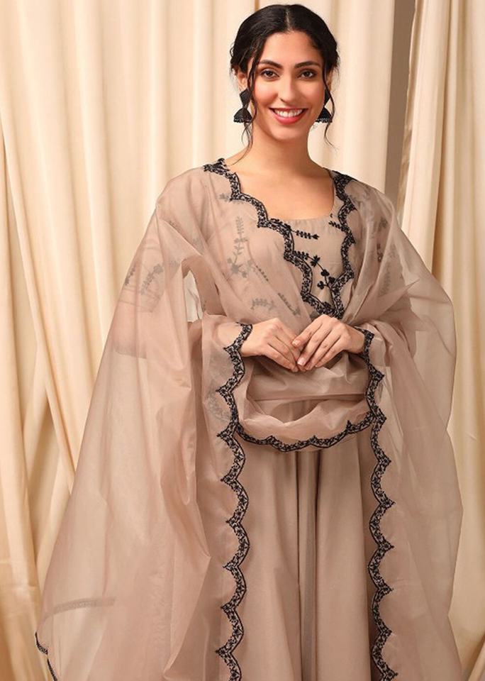 Trendmalls Women's G269 Beige Salwar Suit Set Ethnic Anarkali Kurta Pant Organza Embroidery Indian/Pakistani Wedding All Seasons