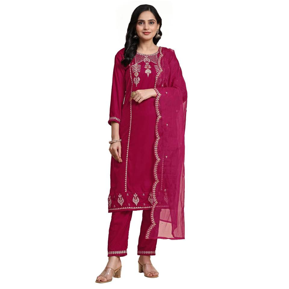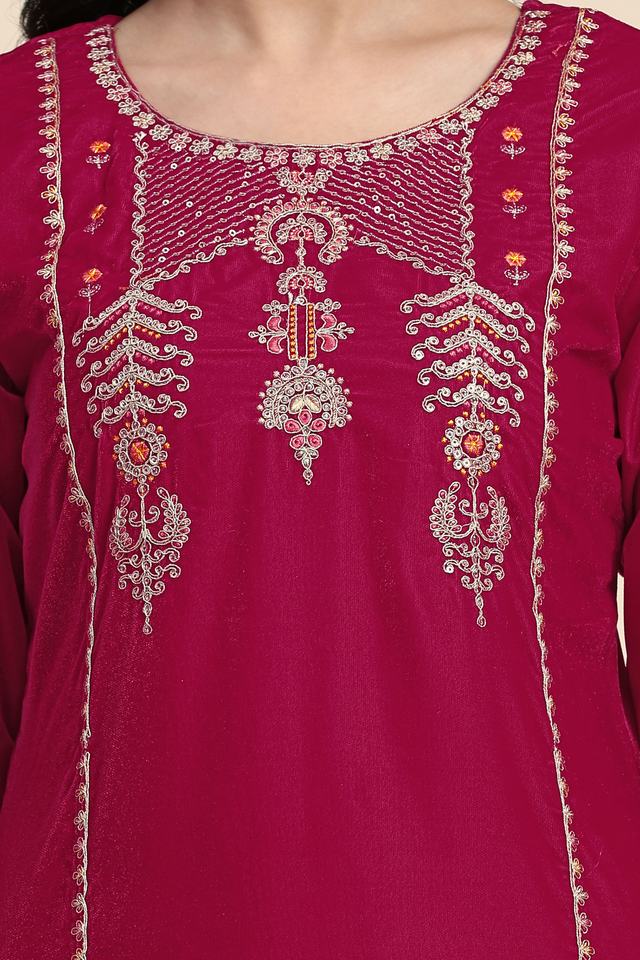 Trendmalls Women's Ethnic Velvet Embroidery Salwar Suit Set Kurta Pant with Dupatta (G235-Pink) for Wedding