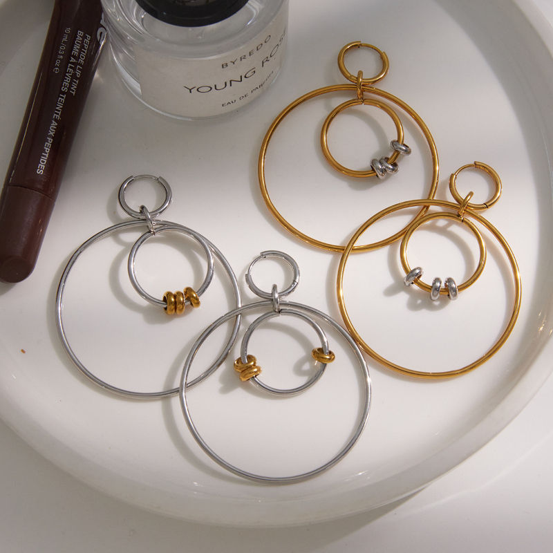 Boucles d'oreilles linéaires multirangs bicolores tendance | Boucles d'oreilles chaîne exagérées en acier inoxydable plaqué or 18 carats