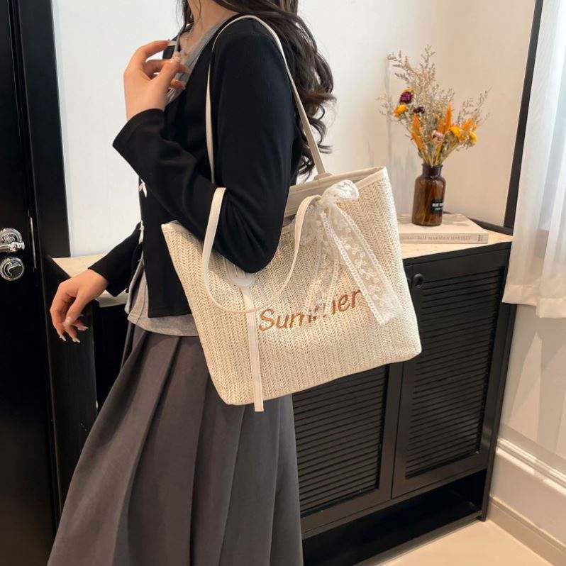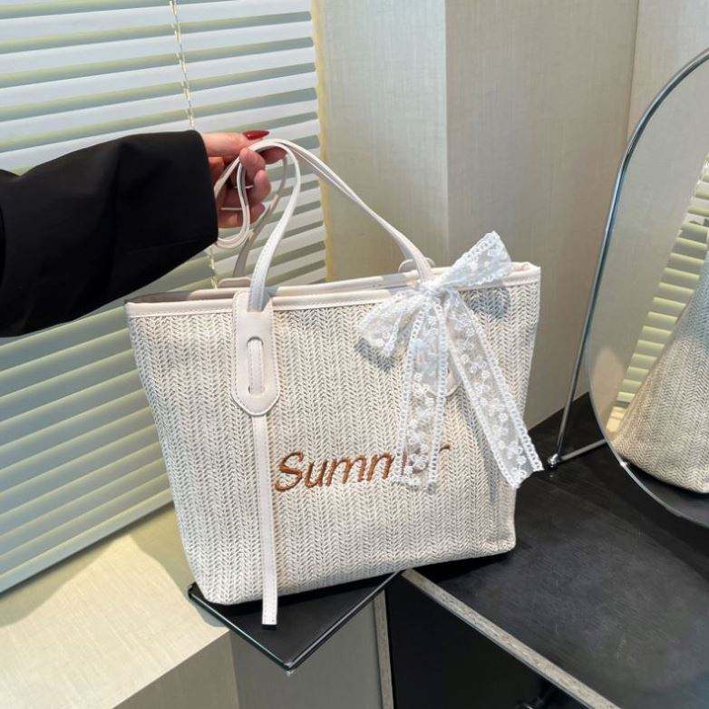 Trendy Casual Women's Tote Bag Solid Color Printed Weave Design Silk Ribbon Decor Lightweight Zippered Large Capacity for Daily