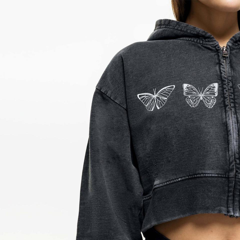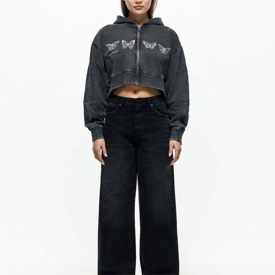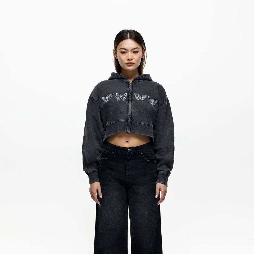 Trendy Cropped Zip Hoodie for Women Washed Winter Streetwear Outfit with Zipper Closure and Drawstring Hood XS Size