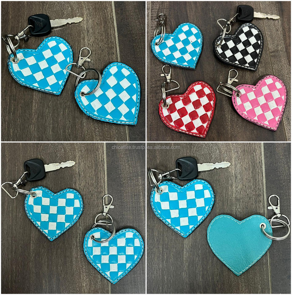 Porte-clés tendance personnalisé à motif à carreaux turquoise et blanc, porte-clés en cuir façonné à la main en forme de cœur pour cadeaux et accessoires