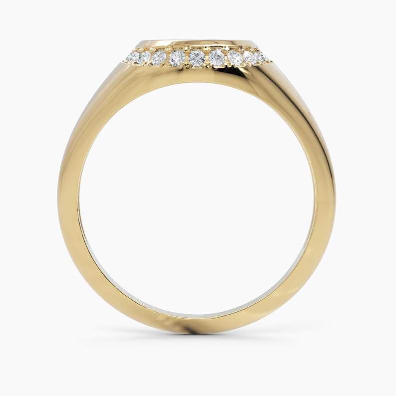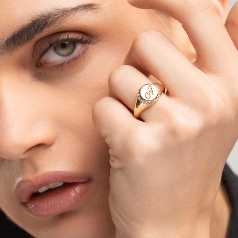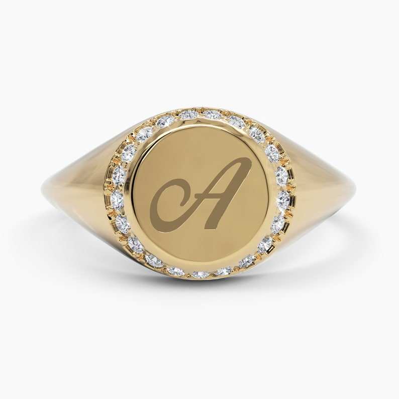 Trendy Handmade 18k Solid Gold Pave Diamond Engraved Signet Rings Personalized Initial Monogram Rings Gift for Her Wholesale OEM