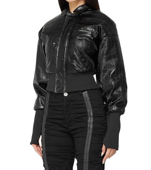 Trendy Biker's Style PU Leather Jacket Heavy Cropped Embossed Bomber Black Sheep Skin Waistbands Cuffs Polyester Lined Crocheted