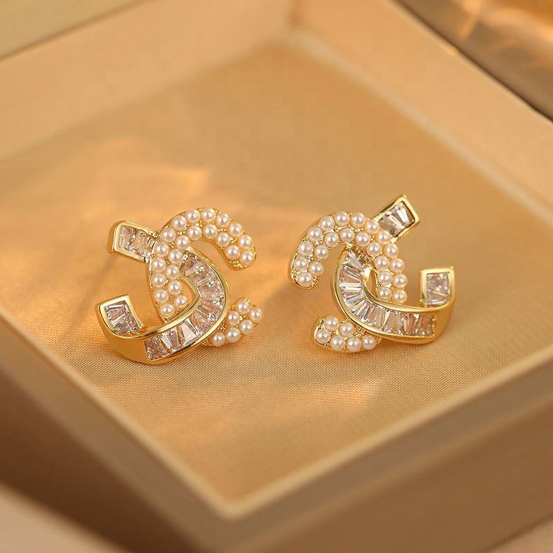 Boucles d'oreilles clous tendance haut de gamme plaquées or avec zircon taille princesse double C pour femme, style petit luxe léger pour tenues de mondaines