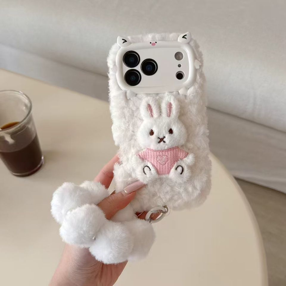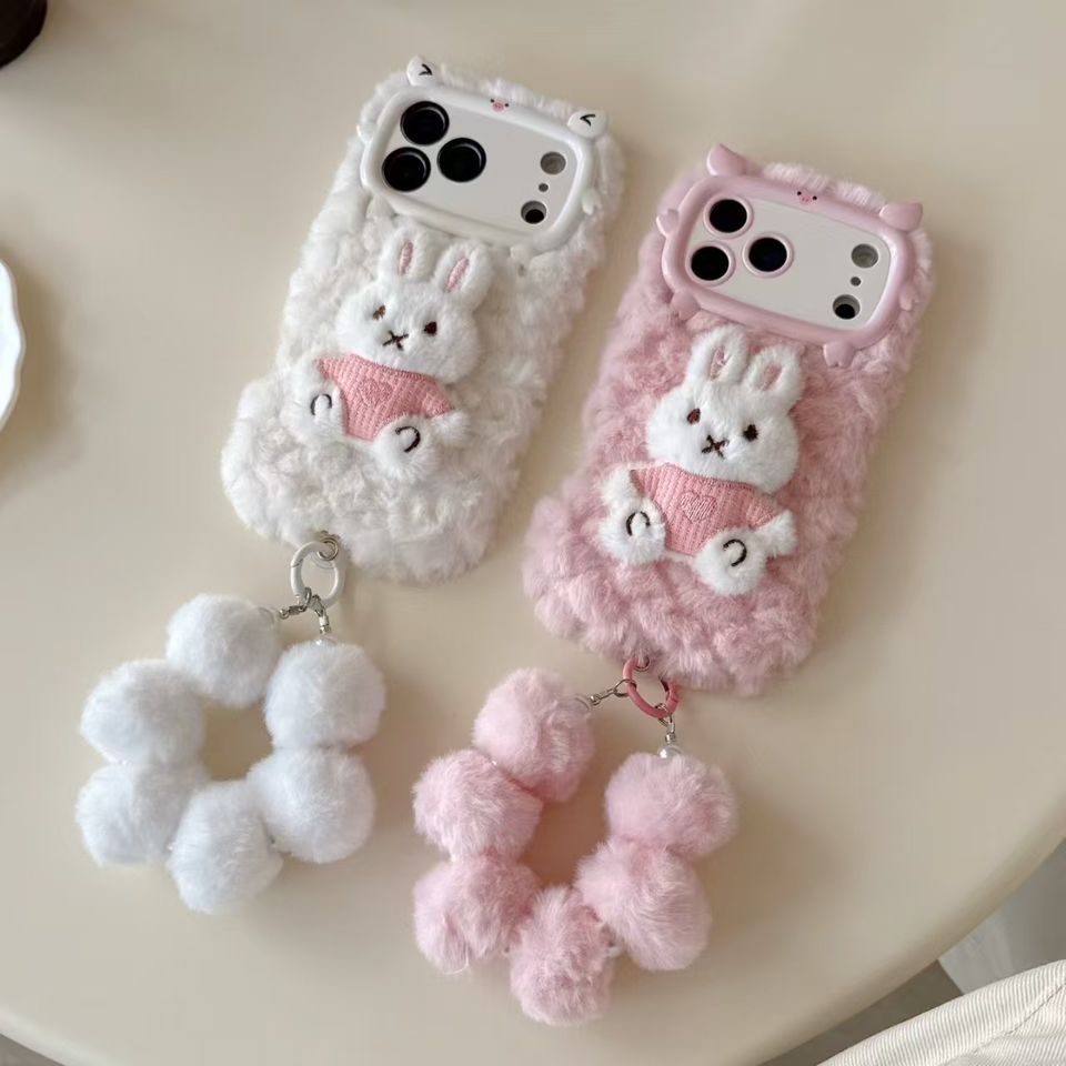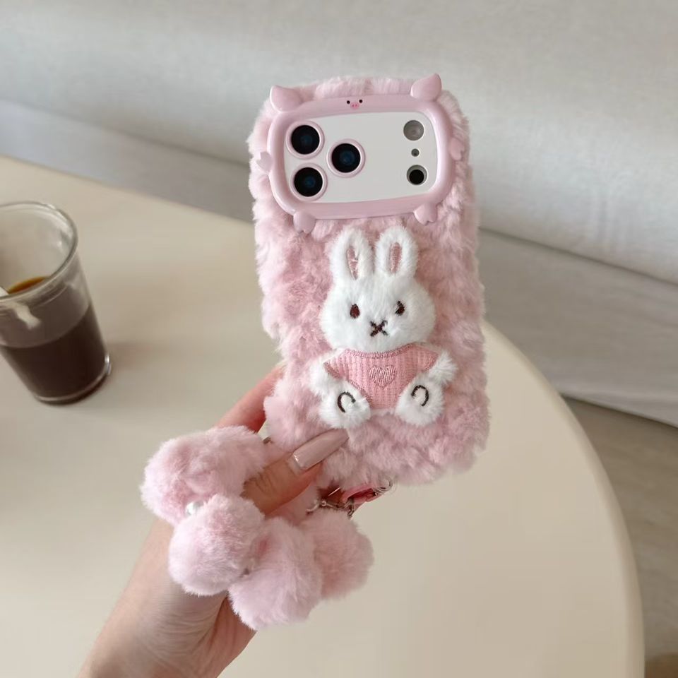 Coque de téléphone tendance et luxueuse en fourrure de lapin avec chaîne, antichoc et protection de l'appareil photo pour les femmes, hiver chaud, coque pour 11-17