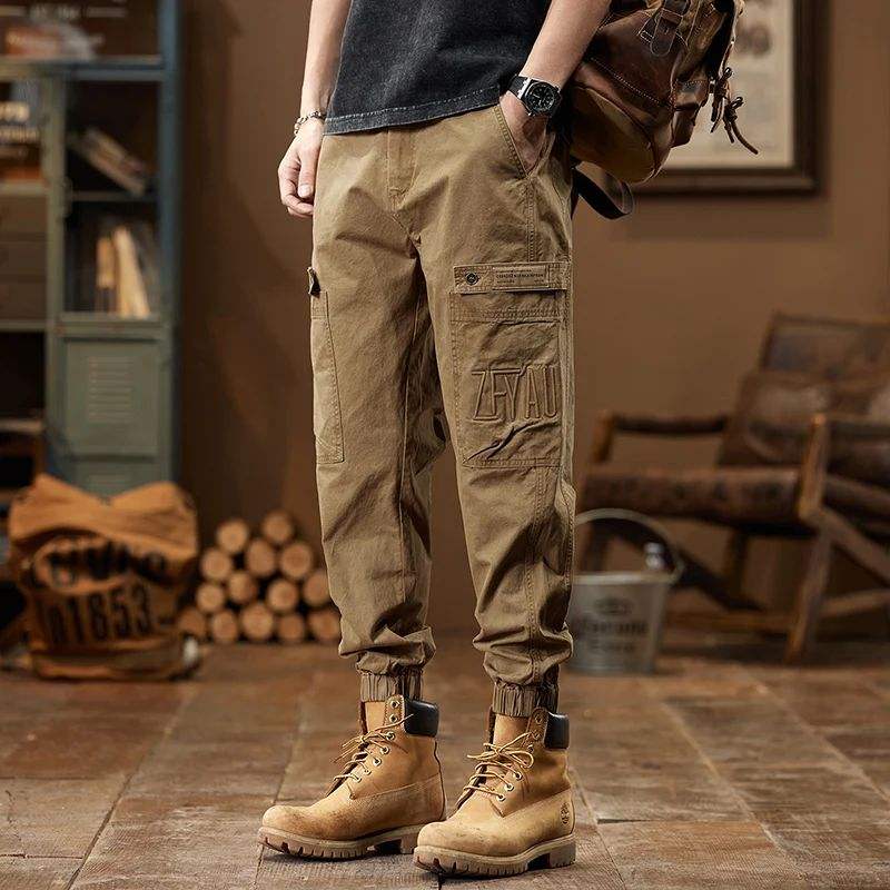 À la mode hommes mi-léger toile Cargo pantalon 100% coton cordon fermeture élastique survêtement pantalon poche décontracté mode