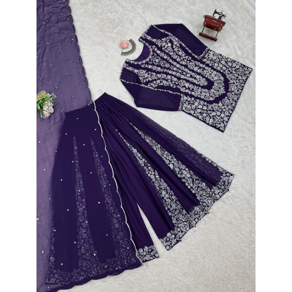 Trendy 2.2 Meter Fully Stitched Faux Georgette Plazo Suit Sequin Thread Embroidery Micro Inner Dupatta Upto Party Summer/Winter
