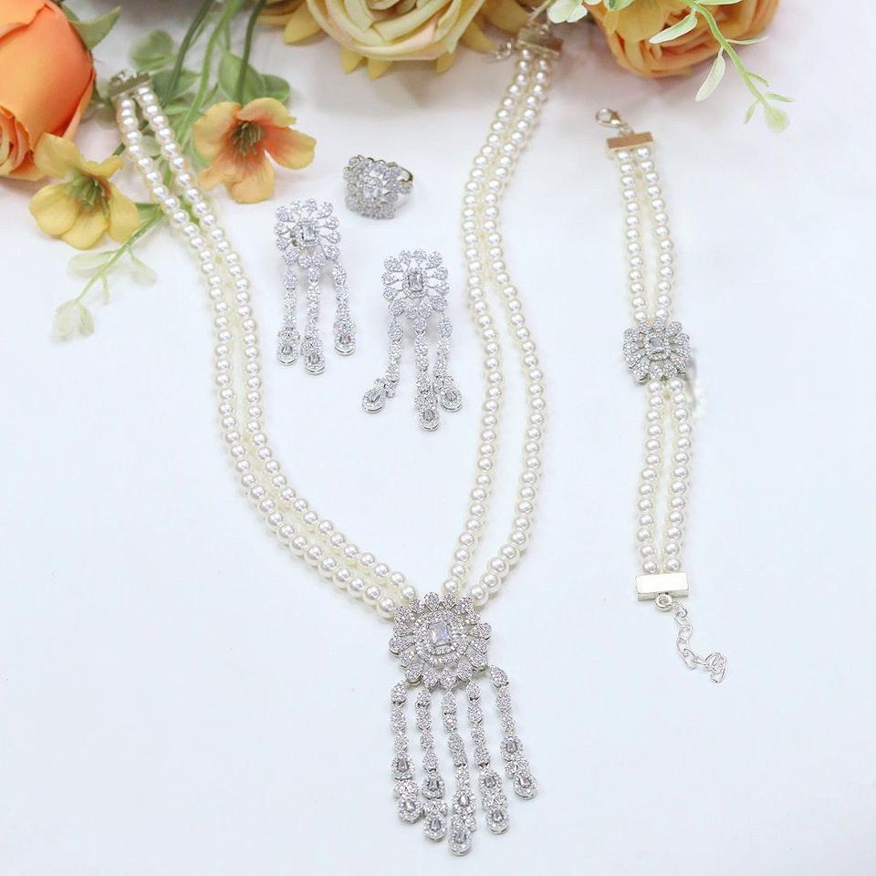 Ensemble de collier tendance en argent avec perles et pierres CZ, avec boucles d'oreilles, bague et bracelet pour les fêtes, collection moderne pour femmes
