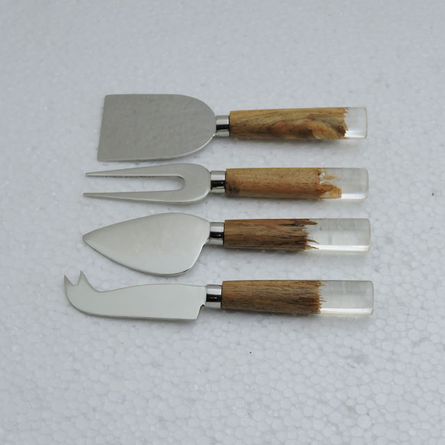 Manche en bois de résine transparente à la mode et acier inoxydable fait à la main 4 pièces ensemble de découpe de fromage accessoires de cuisine maison et cuisine