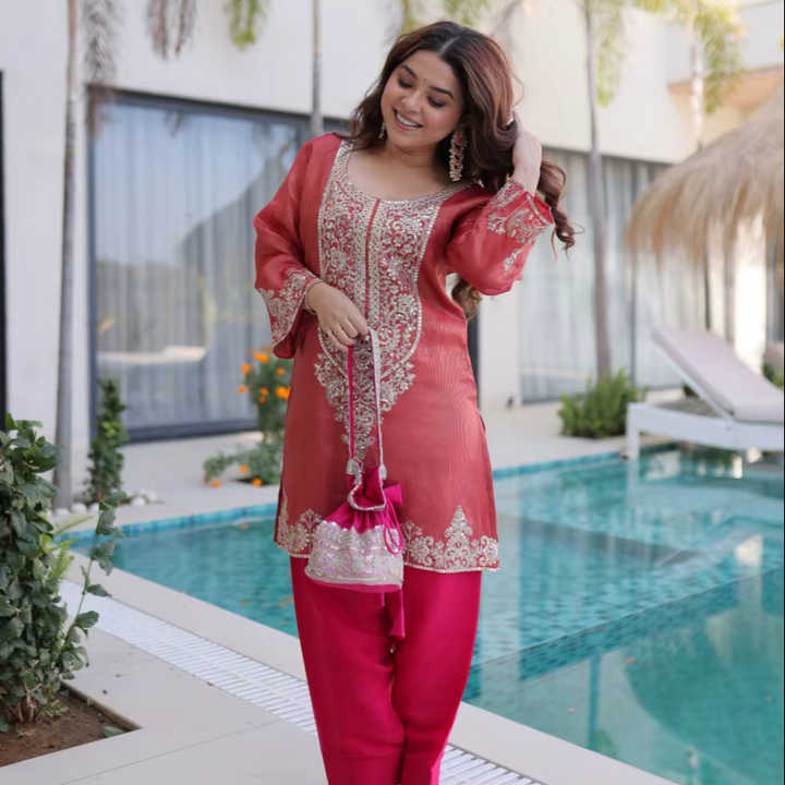 Ensemble Kurti tendance en viscose brodé Zari avec pantalon romain et Batwa de créateur