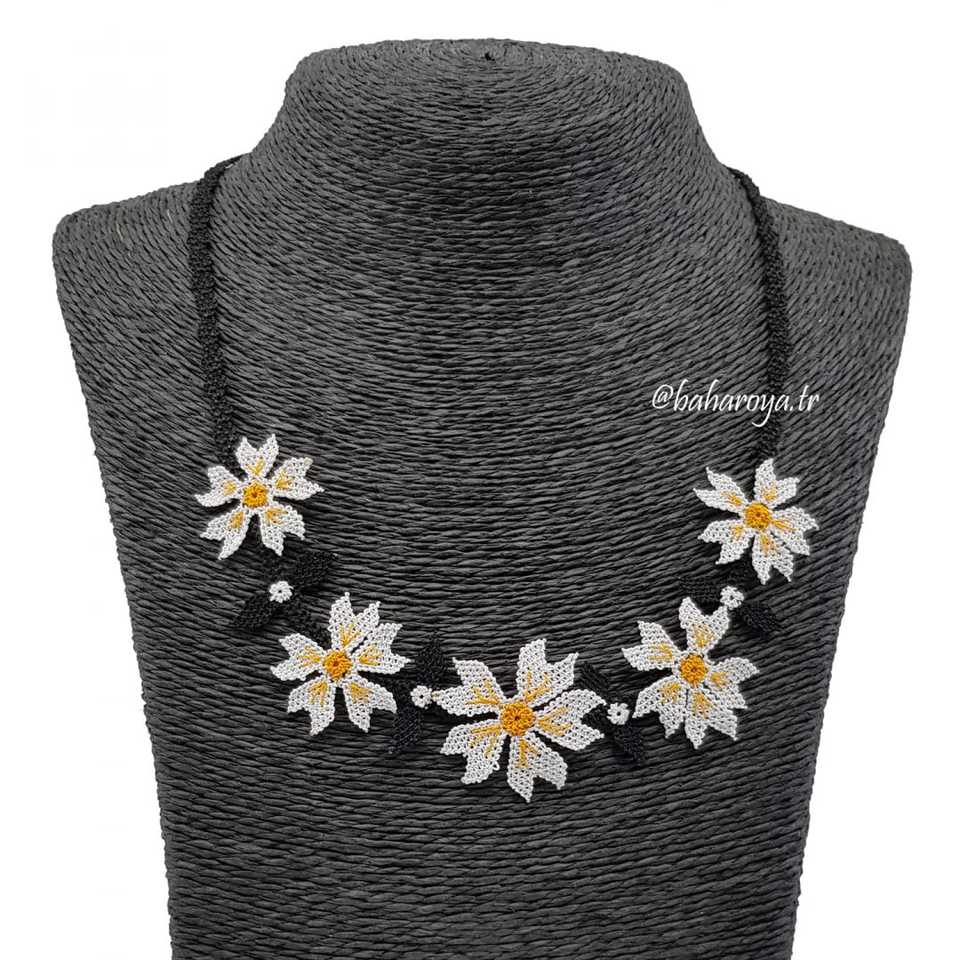Trendy White Garden Flower Necklace with Black Handle Diamond and Pearl Beads Link Chain for Gift or Engagement