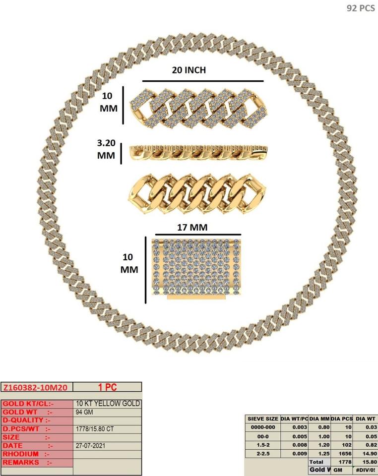 Chaîne cubaine tendance pour homme RB Gems, or jaune 10 carats, certifiée IGI, avec diamants de 10,81 carats - 95 grammes de poids or, cadeau