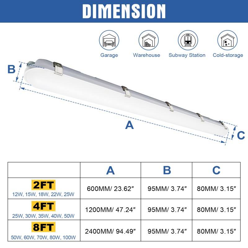 Luminaire LED Tri-Proof IP65 pour panneau, 2FT 4FT 8FT, étanche à la vapeur, pour entrepôts industriels intérieurs, parkings, éclairage linéaire de magasins